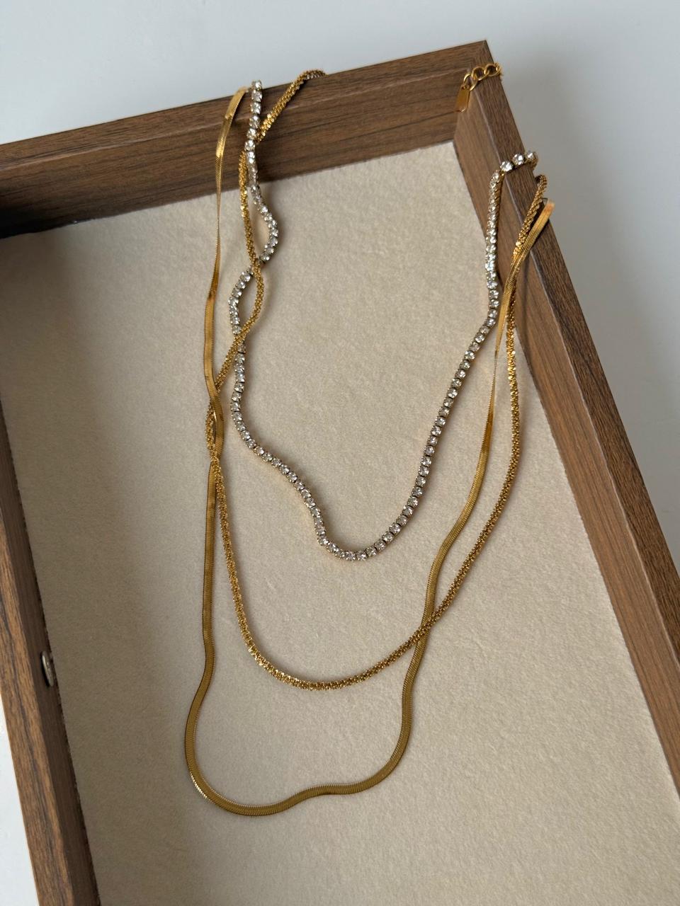 Golden necklace, rhinestone necklace, triple layered necklace, gifts for girls, Pinteresty accessories, anti tarnish necklace, stainless steel necklace