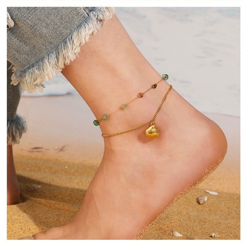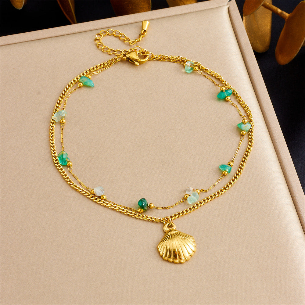 Gold bracelet, green bracelet, shell bracelet, beach bracelet, beach anklet, stainless steel bracelet, anti tarnish bracelet, gifts for girls