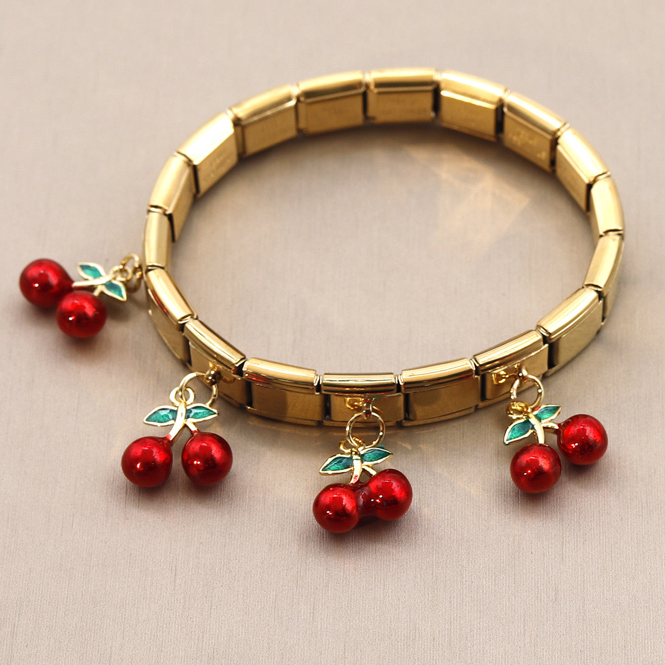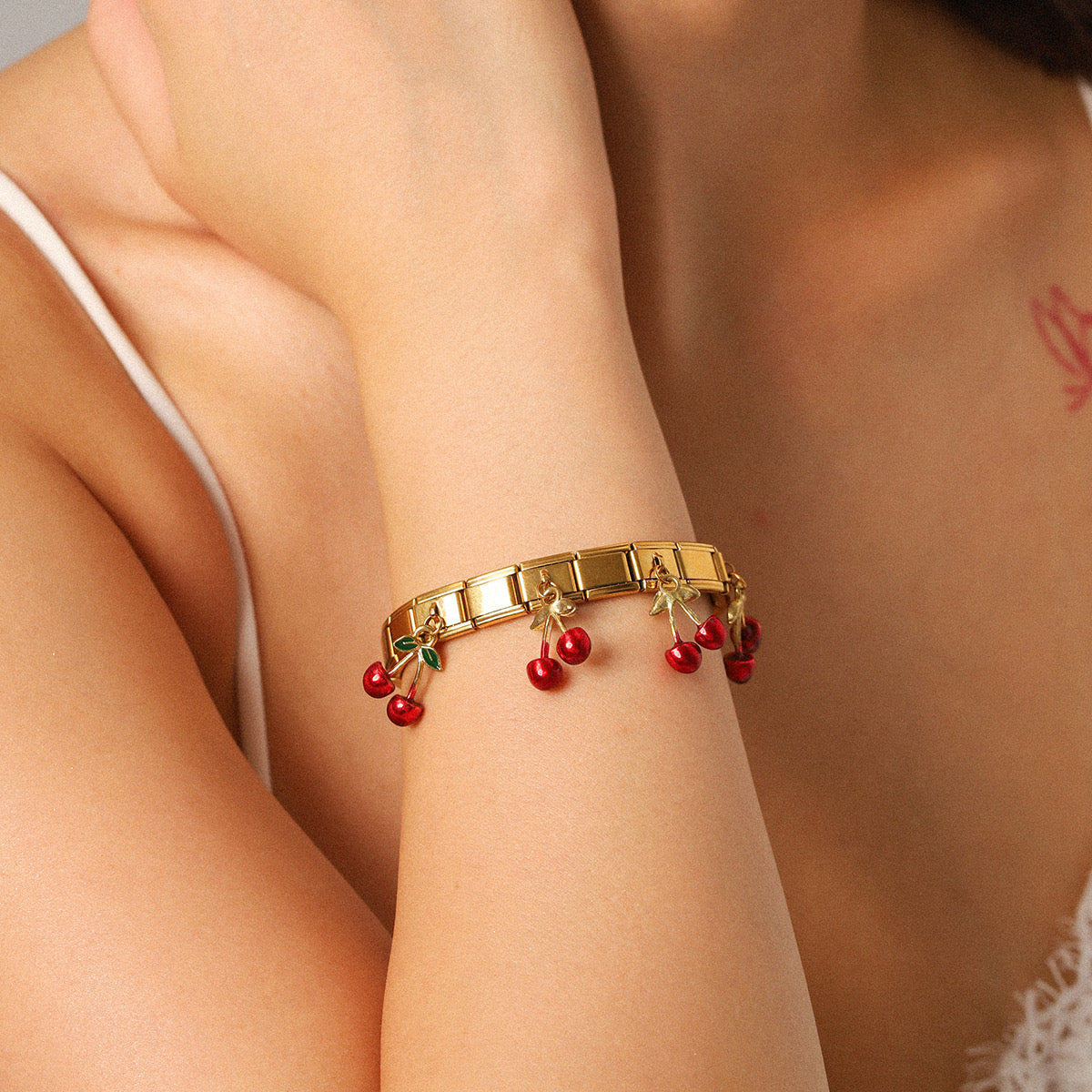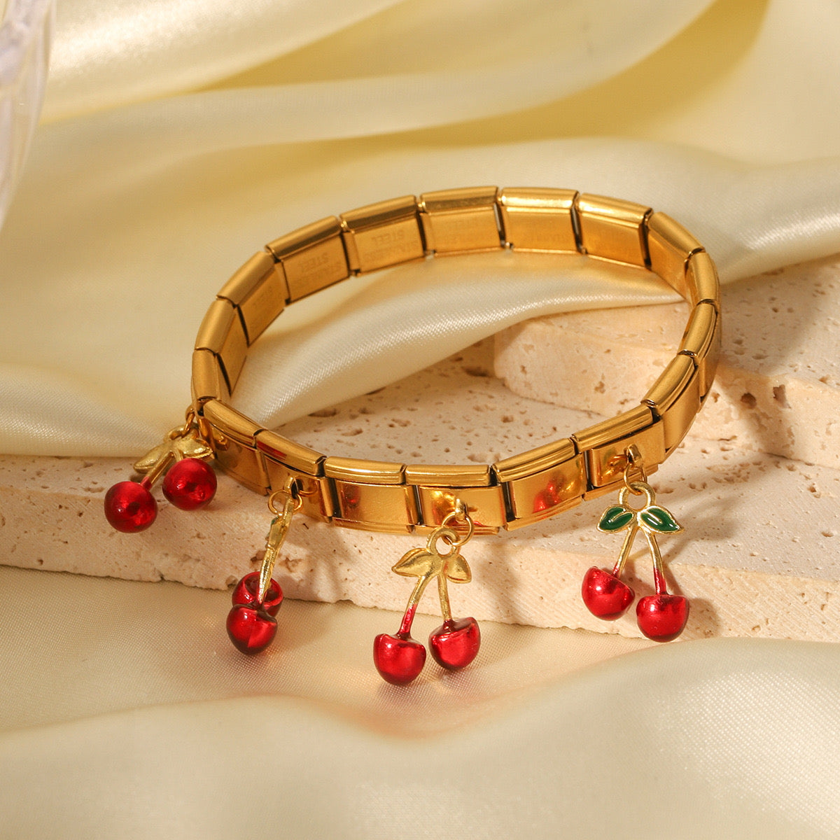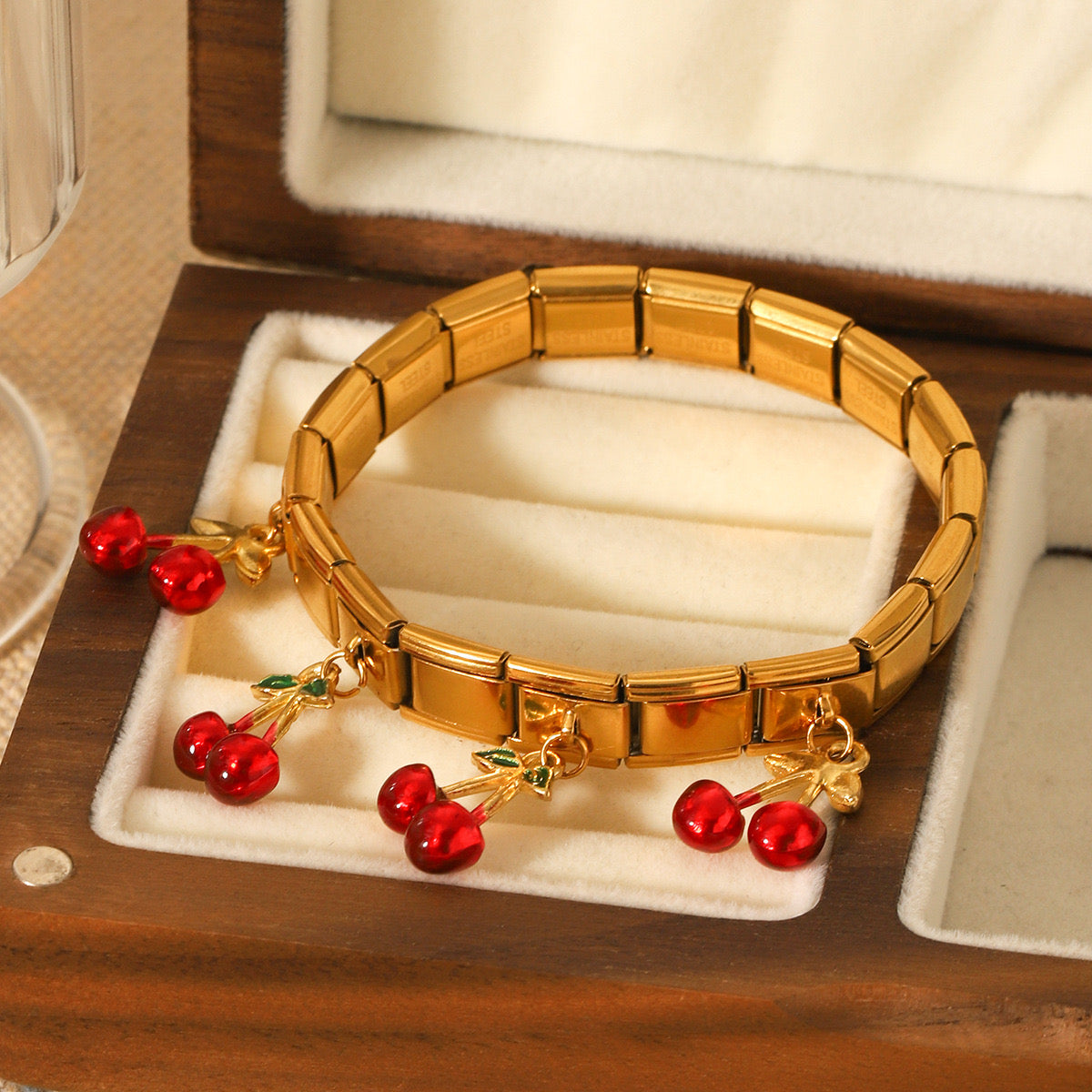 Cherry bracelet, gold bracelet, red bracelet, anti tarnish bracelet, gold bracelet