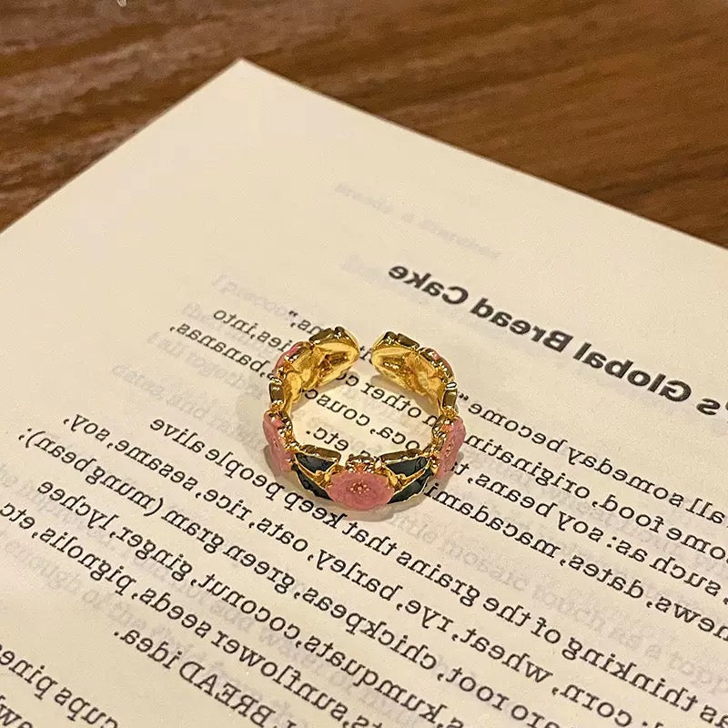 Pink ring, gold jewellery, flower ring, dreamy jewelery, dreamy ring, black ring