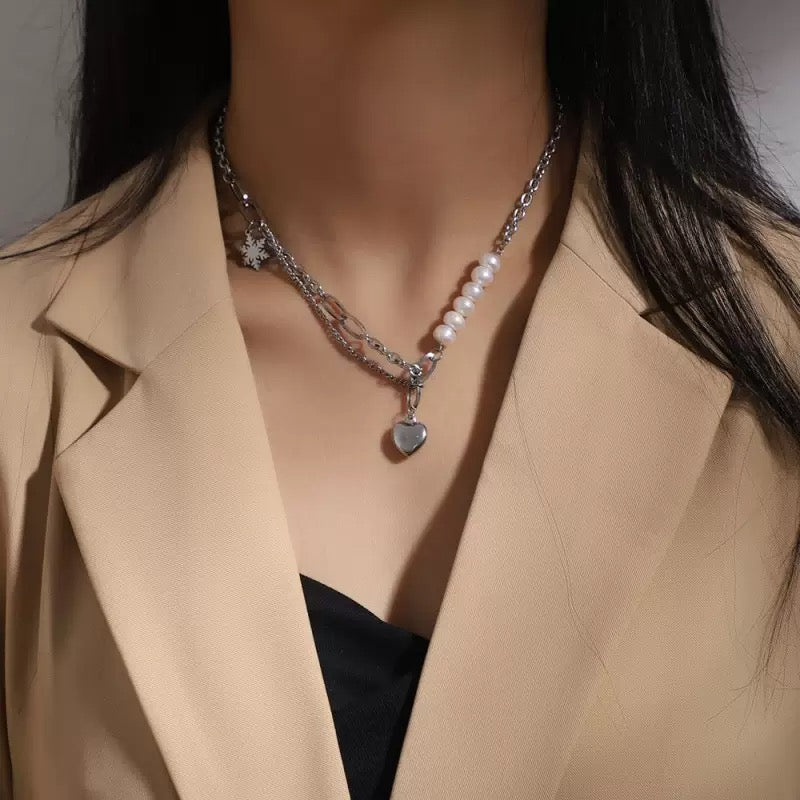 Silver necklace, heart necklace, pearl necklace, gifts for girls, Pinteresty accessories, anti tarnish necklace, stainless steel necklace