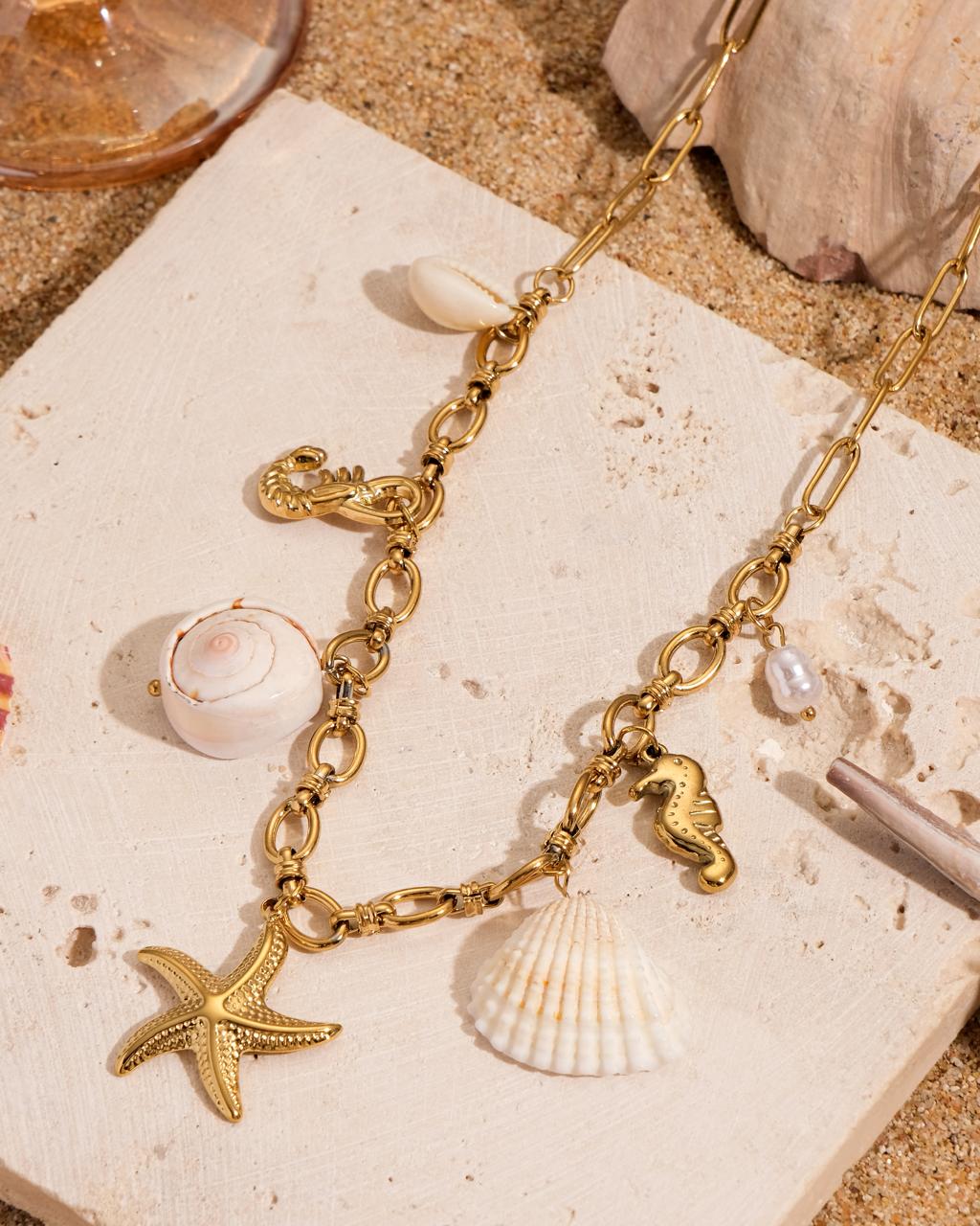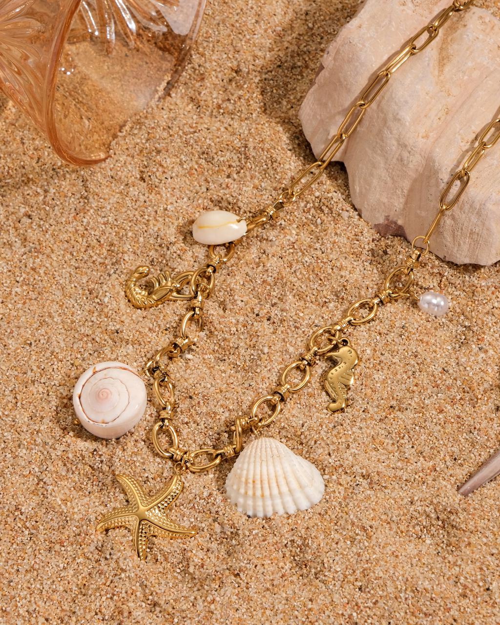 Beach necklace, shell necklace, white necklace, star fish necklace, charms necklace, gold necklace, anti tarnish necklace, gold plated necklace