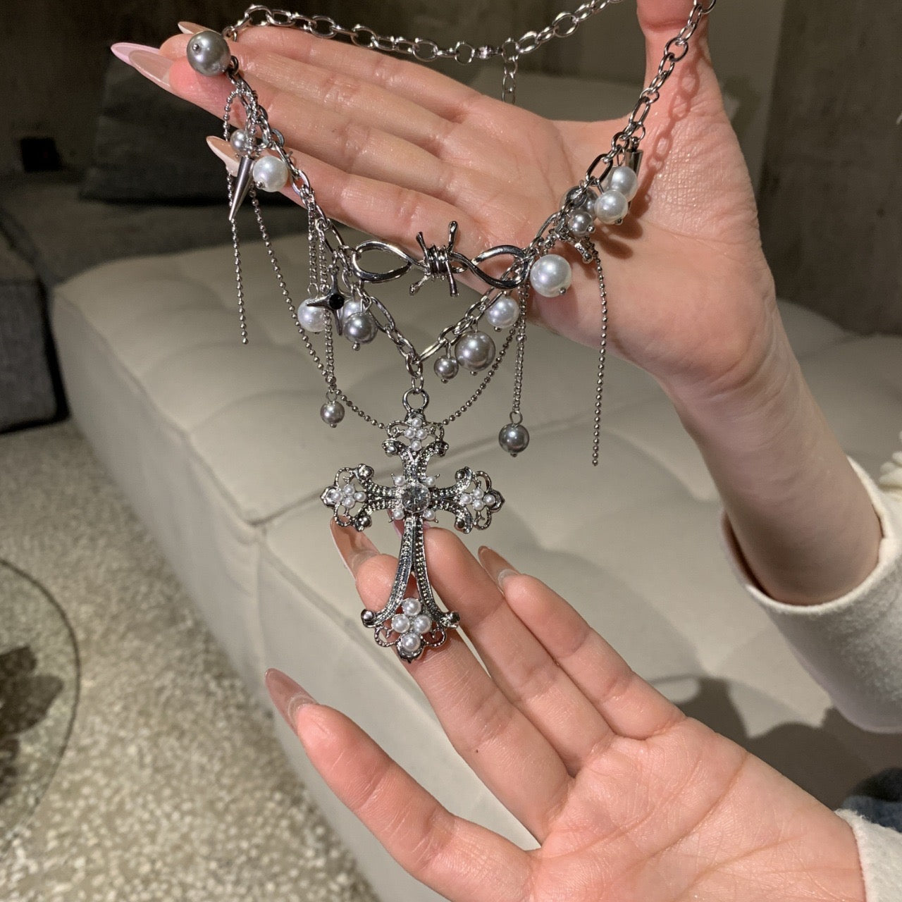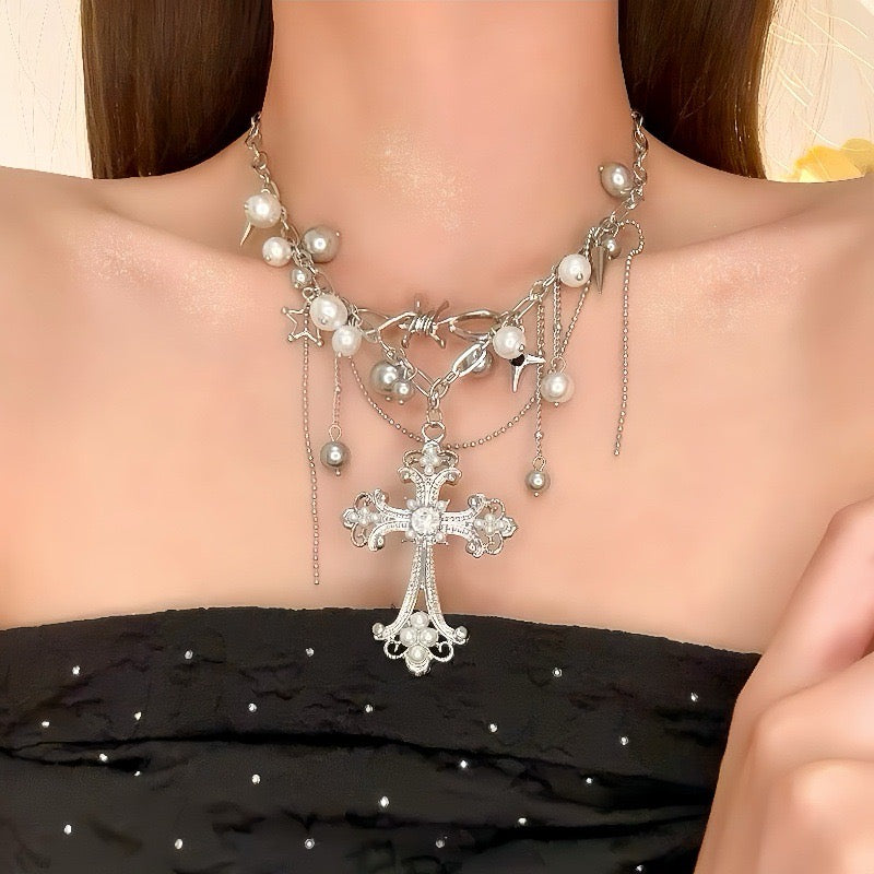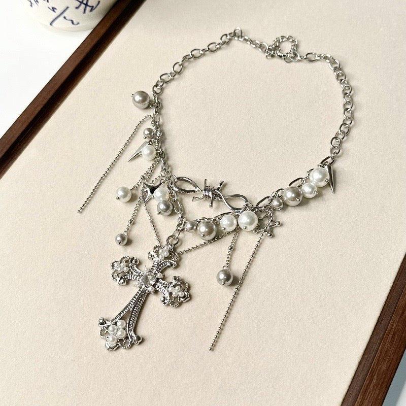 Peal necklace, cross necklace, white necklace, silver necklace, dreamy necklace, fairy core accessories, gifts for girls, Halloween accessories, Halloween jewellery