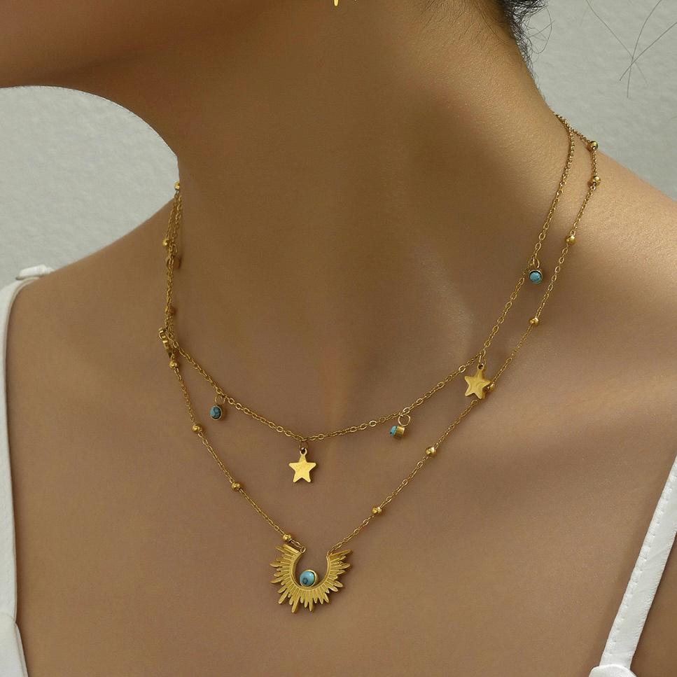 Anti tarnish necklace, blue necklace, premium quality necklace, gifts for her, gold plated necklace, statement necklace, dreamy aesthetic, Pinterest jewellery, sun necklace, stainless steel jewellery.