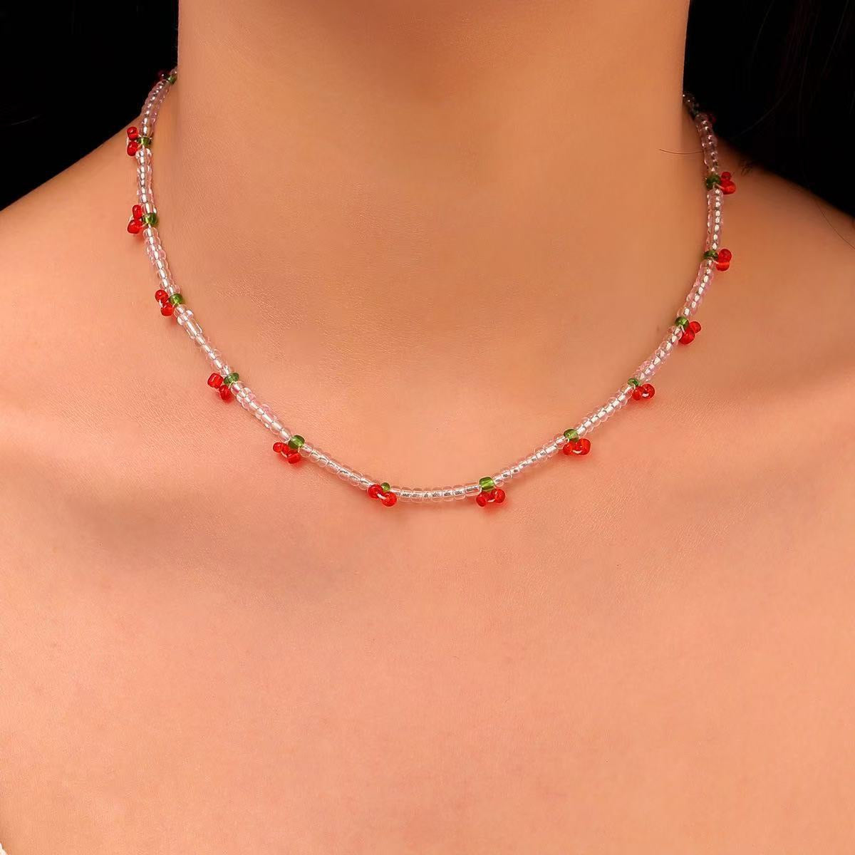 Cherry necklace ,Crystal necklace, white necklace , cherry jewellery , winter jewellery, red necklace , green necklace .