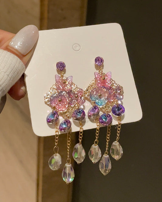 Golden earrings, party earrings, Korean earrings collection , girly girl earrings, glam earrings collection, dreamy earrings, purple earrings, floral earrings, butterfly earrings, flower earrings, dreamy jewellery, handmade earrings.