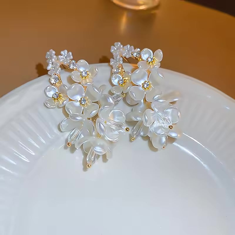 Golden earrings, party earrings, Korean earrings collection , girly girl earrings, glam earrings collection, dreamy earrings, floral earrings, pearl earrings, flower earrings, dreamy jewellery, wedding jewellery