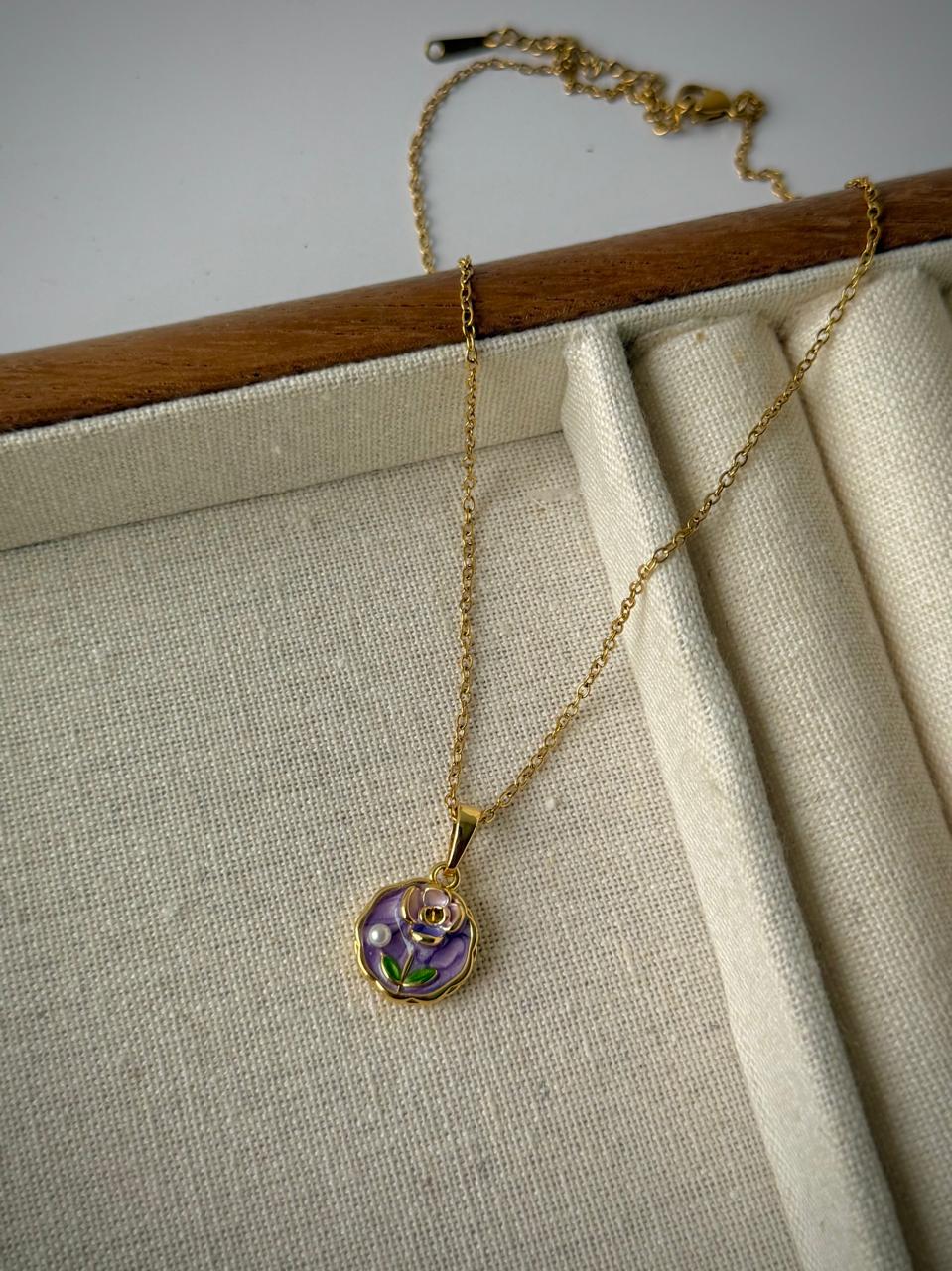 gold necklace, Pinterest inspired accessories, flower necklace, floral jewellery, Anti tarnish necklace, stainless steel necklace, gold plated necklace, old money aesthetic, Pearl jewellery, purple flower necklace