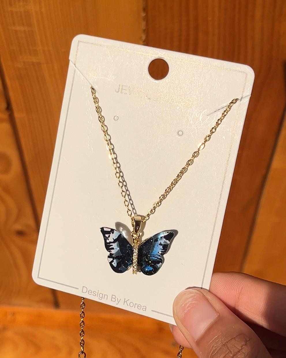 Minimal necklace, stainless steel necklace , blue necklace, blue butterfly necklace, golden necklace, anti tarnish necklace, anti tarnish jewellery, butterfly necklace, butterfly jewellery.