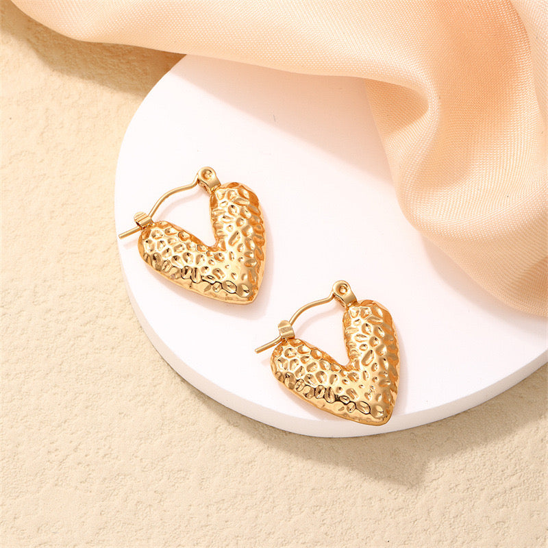 Gold earrings, gold plated earrings, heart earrings, textured earrings, trendy earrings, Pinteresty earrings, anti tarnish earrings, Pinterest inspired jewellery