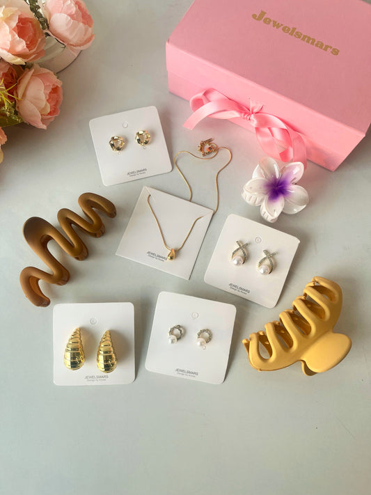 [ pink hair bow, earrings, gift hamper, diwali gift hamper, bhaidoojĀ gift for sister, stainless steelĀ accessories, Ā korean earrings , Pinterest inspired jewellery ]