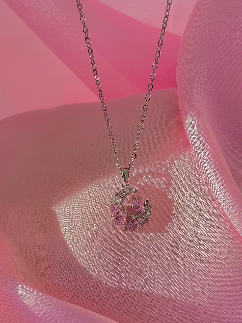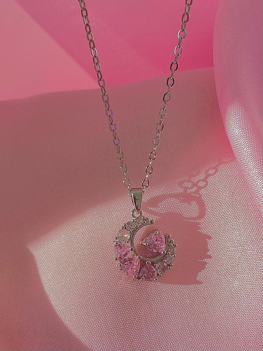 stainless steel necklace , silver necklace, anti tarnish necklace, anti tarnish jewellery, moon necklace, pink heart necklace, heart jewellery.