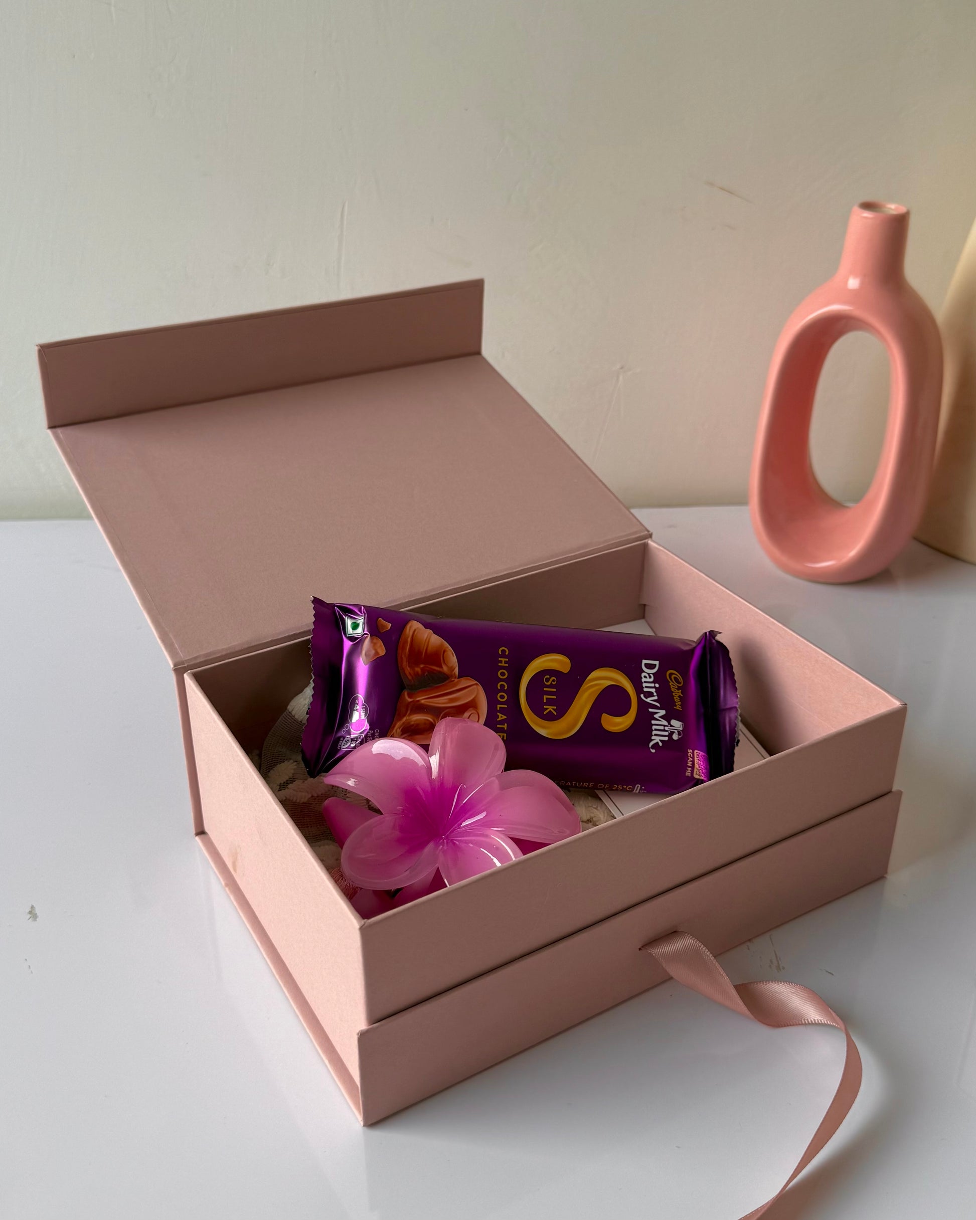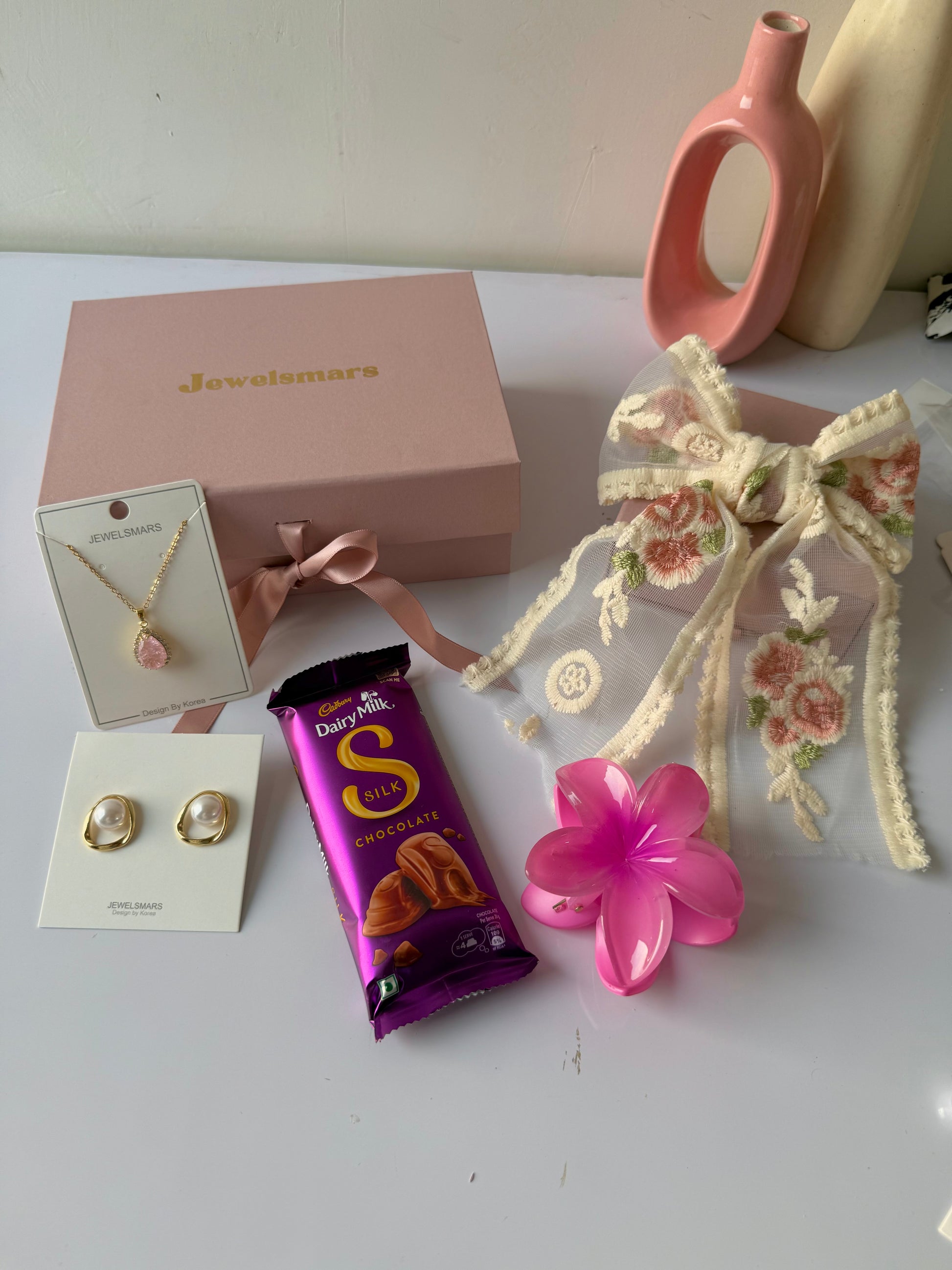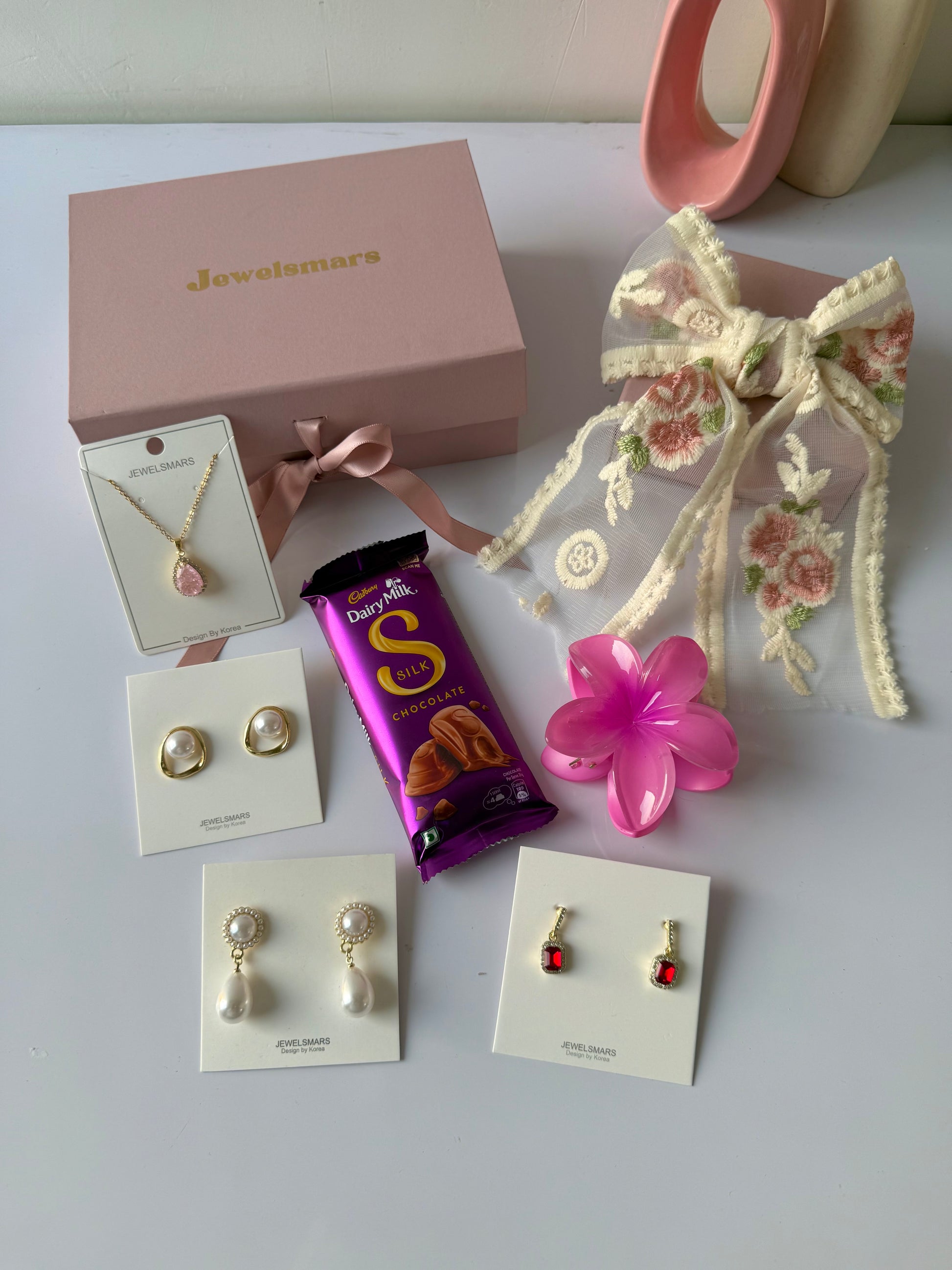 [ pink hair bow, earrings, gift hamper, birthday gift hamper, diwali gift hamper, bhaidooj gift for sister, pink accessories, pink purple bracelet, pink jewellery, korean earrings , Pinterest inspired jewellery ]