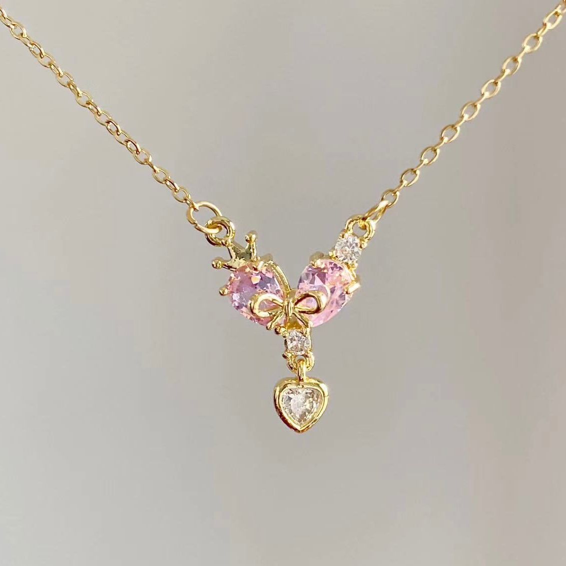 stainless steel necklace , golden necklace, anti tarnish necklace, anti tarnish jewellery, bow necklace, pink necklace, heart jewelery.