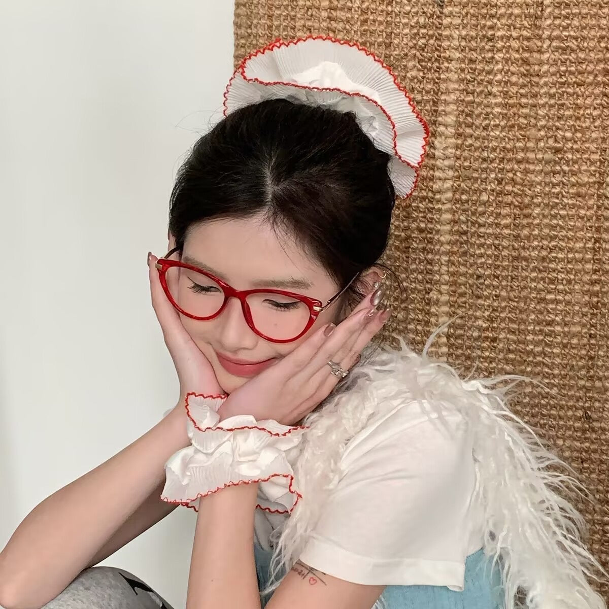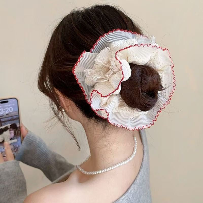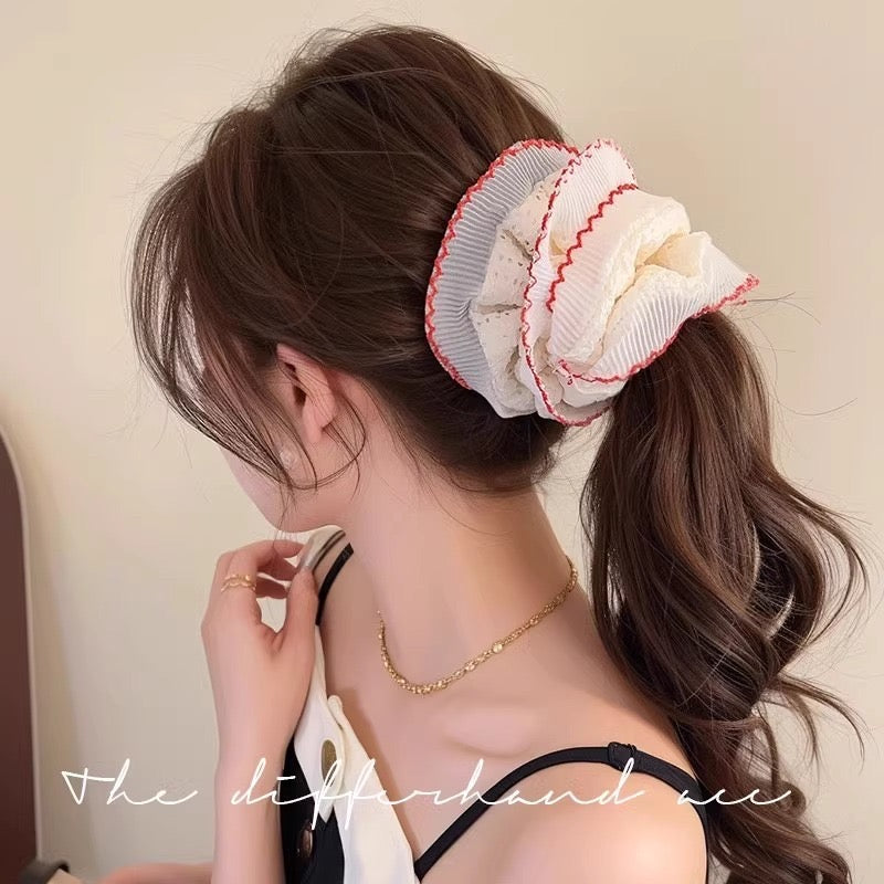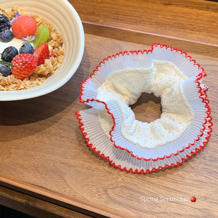 Cute scrunchie, pinteresty hair accessories, cute hair accessories, scrunchies, Pinterest inspired, cute accessories, soft girl aesthetic, aesthetic accessories, white scrunchie, frill scrunchies, red scrunchie