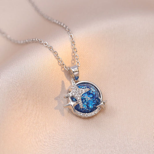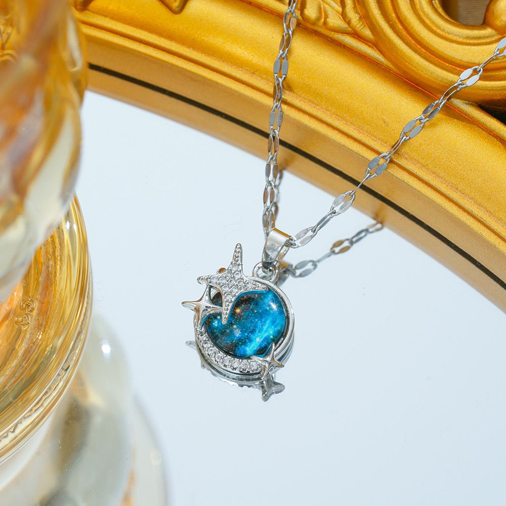 stainless steel necklace , silver necklace, anti tarnish necklace, anti tarnish jewellery, star necklace, blue necklace, planet jewelery.